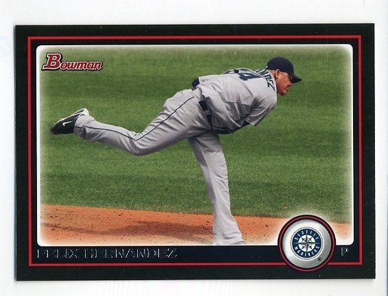 more Great cards @ www.everythingcollectibles.biz For Sale is a 2010 Bowman #186 Felix Hernandez Mariners in NrMt Condition. all single cards are shipped in Penny Sleeves and top loaders. all orders ship with delivery confirmation as well. we usually ship within 2 days of receiving an order. Shipping is a Flat $2 no matter how many cards you buy 1 or 1000 its still $2.
