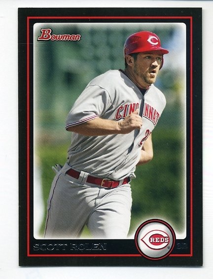 more Great cards @ www.everythingcollectibles.biz For Sale is a 2010 Bowman #42 Scott Rolen Reds in NrMt Condition. all single cards are shipped in Penny Sleeves and top loaders. all orders ship with delivery confirmation as well. we usually ship within 2 days of receiving an order. Shipping is a Flat $2 no matter how many cards you buy 1 or 1000 its still $2.