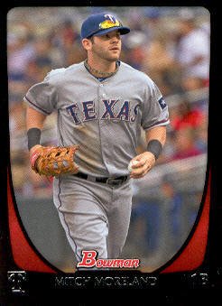 more Great cards @ www.everythingcollectibles.biz For Sale is a 2011 Bowman #97 Mitch Moreland Rangers in NrMt Condition. all single cards are shipped in Penny Sleeves and top loaders. all orders ship with delivery confirmation as well. we usually ship within 2 days of receiving an order. Shipping is a Flat $2 no matter how many cards you buy 1 or 1000 its still $2.
