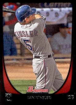 more Great cards @ www.everythingcollectibles.biz For Sale is a 2011 Bowman #40 Ian Kinsler Rangers in NrMt Condition. all single cards are shipped in Penny Sleeves and top loaders. all orders ship with delivery confirmation as well. we usually ship within 2 days of receiving an order. Shipping is a Flat $2 no matter how many cards you buy 1 or 1000 its still $2.