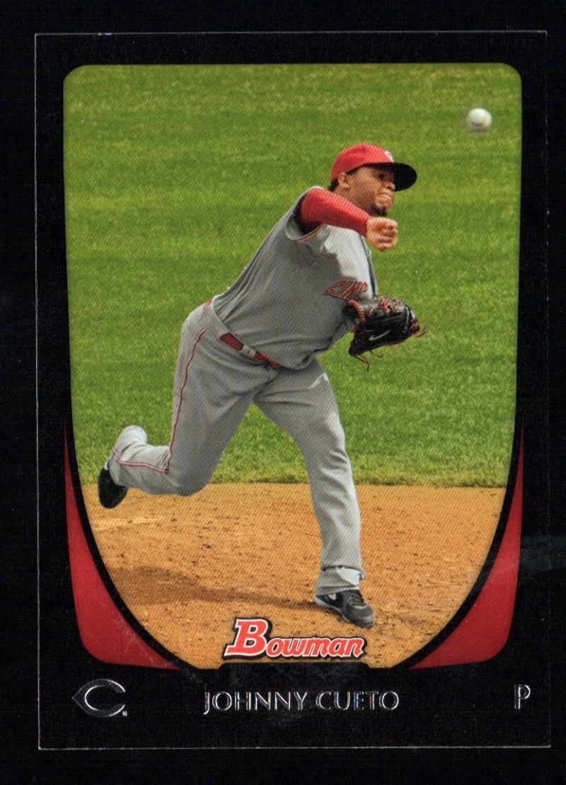 more Great cards @ www.everythingcollectibles.biz For Sale is a 2011 Bowman #112 Johnny Cueto Reds in NrMt Condition. all single cards are shipped in Penny Sleeves and top loaders. all orders ship with delivery confirmation as well. we usually ship within 2 days of receiving an order. Shipping is a Flat $2 no matter how many cards you buy 1 or 1000 its still $2.