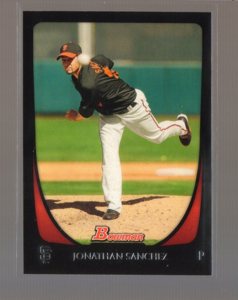 more Great cards @ www.everythingcollectibles.biz For Sale is a 2011 Bowman #54 JONATHAN SANCHEZ Giants in NrMt Condition. all single cards are shipped in Penny Sleeves and top loaders. all orders ship with delivery confirmation as well. we usually ship within 2 days of receiving an order. Shipping is a Flat $2 no matter how many cards you buy 1 or 1000 its still $2.