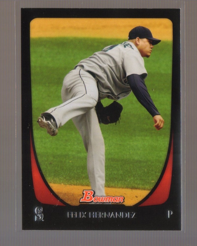 more Great cards @ www.everythingcollectibles.biz For Sale is a 2011 Bowman #137 FELIX HERNANDEZ Mariners in NrMt Condition. all single cards are shipped in Penny Sleeves and top loaders. all orders ship with delivery confirmation as well. we usually ship within 2 days of receiving an order. Shipping is a Flat $2 no matter how many cards you buy 1 or 1000 its still $2.