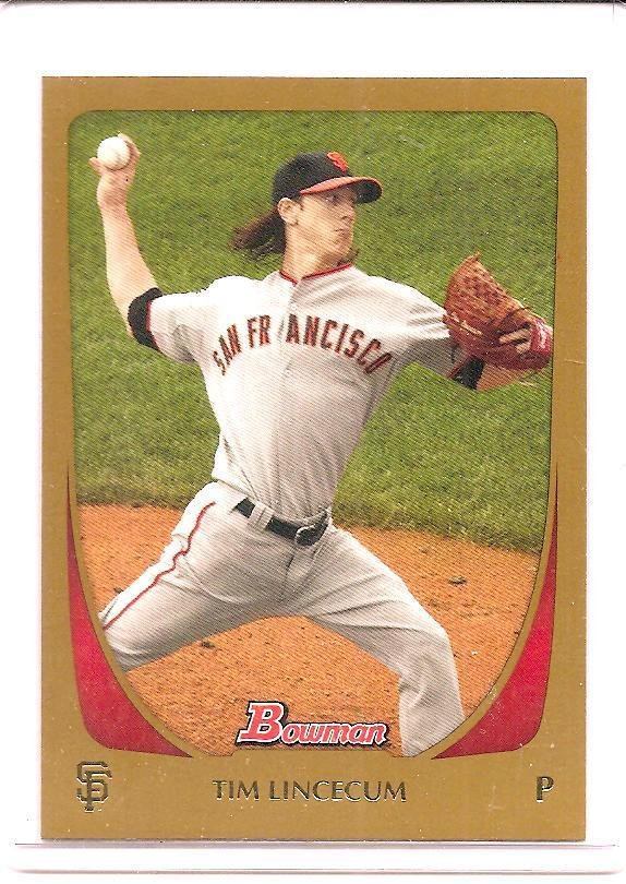 more Great cards @ www.everythingcollectibles.biz For Sale is a 2011 Bowman Gold #141 Tim Lincecum Giants in NrMt Condition. all single cards are shipped in Penny Sleeves and top loaders. all orders ship with delivery confirmation as well. we usually ship within 2 days of receiving an order. Shipping is a Flat $2 no matter how many cards you buy 1 or 1000 its still $2.