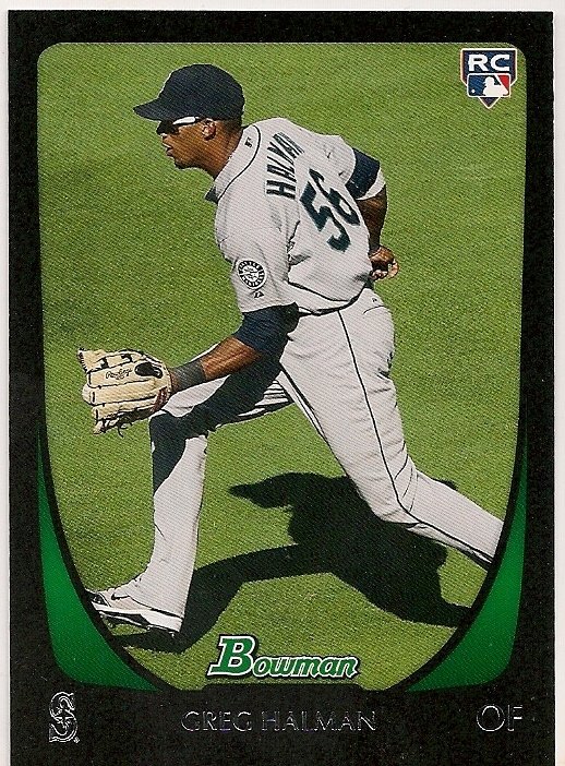 more Great cards @ www.everythingcollectibles.biz For Sale is a 2011 Bowman #198 Greg Halman Mariners RC in NrMt Condition. all single cards are shipped in Penny Sleeves and top loaders. all orders ship with delivery confirmation as well. we usually ship within 2 days of receiving an order. Shipping is a Flat $2 no matter how many cards you buy 1 or 1000 its still $2.