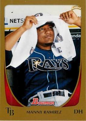 more Great cards @ www.everythingcollectibles.biz For Sale is a 2011 Bowman Gold #90 Manny Ramirez Rays in NrMt Condition. all single cards are shipped in Penny Sleeves and top loaders. all orders ship with delivery confirmation as well. we usually ship within 2 days of receiving an order. Shipping is a Flat $2 no matter how many cards you buy 1 or 1000 its still $2.