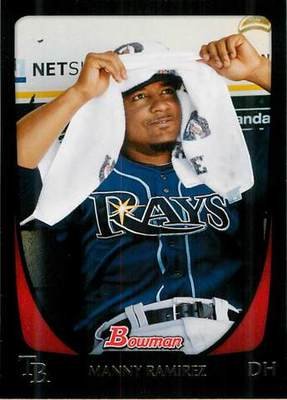 more Great cards @ www.everythingcollectibles.biz For Sale is a 2011 Bowman #90 Manny Ramirez Rays in NrMt Condition. all single cards are shipped in Penny Sleeves and top loaders. all orders ship with delivery confirmation as well. we usually ship within 2 days of receiving an order. Shipping is a Flat $2 no matter how many cards you buy 1 or 1000 its still $2.