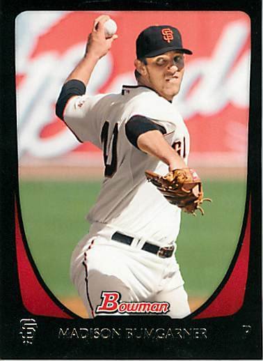 more Great cards @ www.everythingcollectibles.biz For Sale is a 2011 Bowman #127 Madison Bumgarner San Francisco Giants in NrMt Condition. all single cards are shipped in Penny Sleeves and top loaders. all orders ship with delivery confirmation as well. we usually ship within 2 days of receiving an order. Shipping is a Flat $2 no matter how many cards you buy 1 or 1000 its still $2.