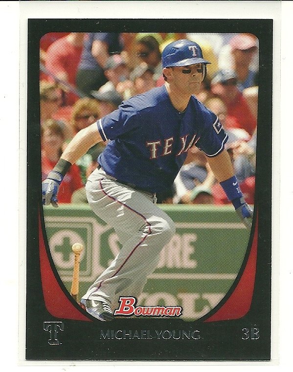 more Great cards @ www.everythingcollectibles.biz For Sale is a 2011 Bowman Baseball # 159 Michael Young Rangers in NrMt Condition. all single cards are shipped in Penny Sleeves and top loaders. all orders ship with delivery confirmation as well. we usually ship within 2 days of receiving an order. Shipping is a Flat $2 no matter how many cards you buy 1 or 1000 its still $2.