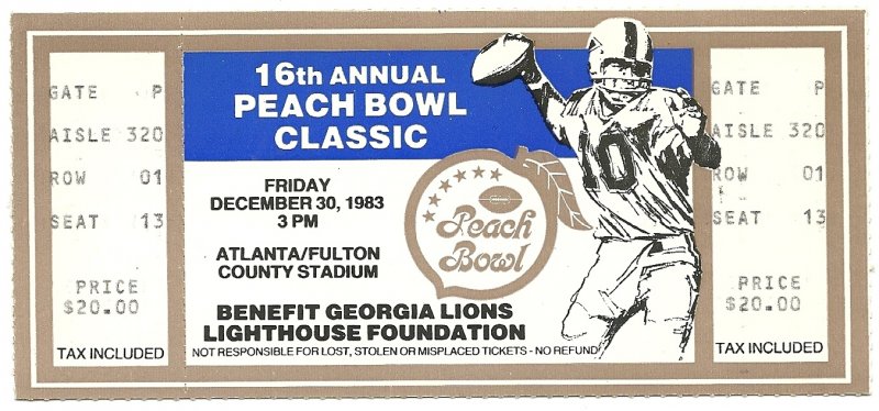1983 Peach Bowl Game Full Ticket Florida State North Carolina. This Ticket is in Very Good Condition no rips tears writing or creases nice RARE piece of College football History. if you have any questions please don't hesitate to ask. Fast same or next day shipping with delivery confirmation within the U.S. This Item Ships Free within the United States.