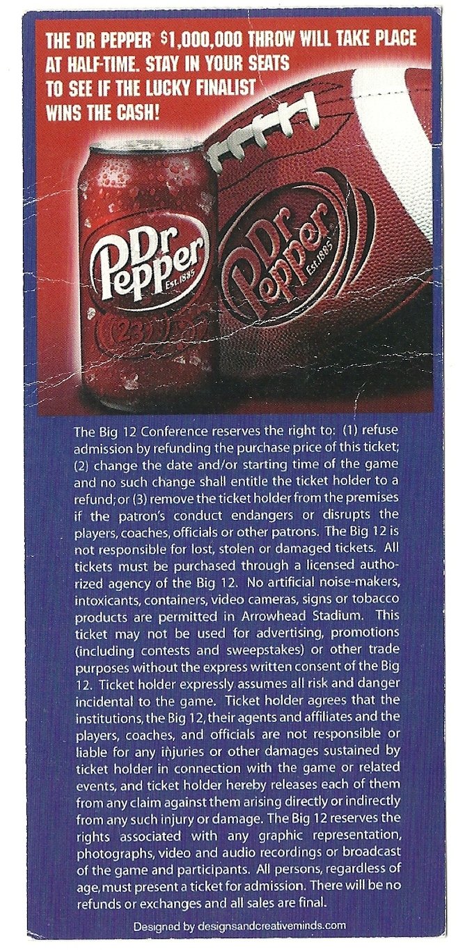 2006 Big 12 Championship Game ticket Stub Oklahoma Nebraska. This Ticket is in very good condition no rips tears writing or creasing but does have some handling wear as seen in the picture does not distract from its rarity still a rare vintage hard to find