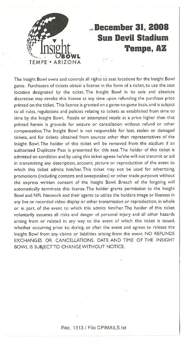 2008 Insight Bowl Game Full Ticket Kansas Minnessota. This is a Ticket stub in good used condition with minor handling wear as pictured. a RARE piece of College Bowl History if you have any further questions please dont hesitate to ask!