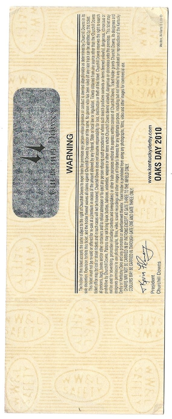 2010 Kentucky Oaks Full Ticket. This Ticket is in very good condition no rips tears or writing anywhere on the ticket! A nice RARE piece of Horse Racing History if you have any further questions please dont hesitate to ask!