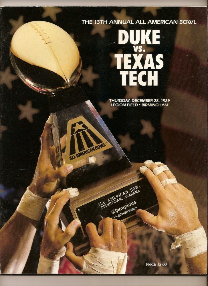 More Great Collectibles @ www.everythingcollectibles.biz. Up For Sale is a Rare 1989 All American Bowl Game Program Duck Texas Tech. Its In very Good Condition No Rips Tears or Writing In or On the Program Just Some minor Handling wear as you can see from the pictures provided. If you have any additional questions please dont hesitate to ask.