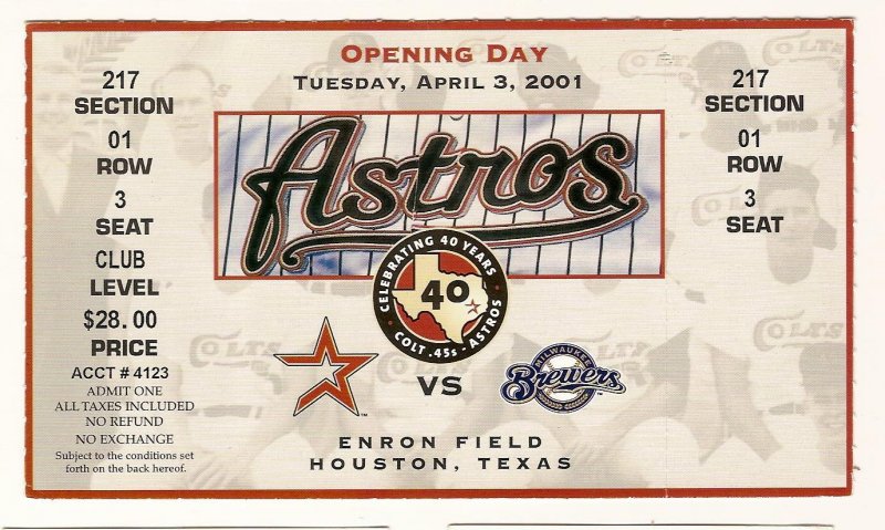 2001 Houston Astros Opening day Full Unused Ticket Vs Brewers