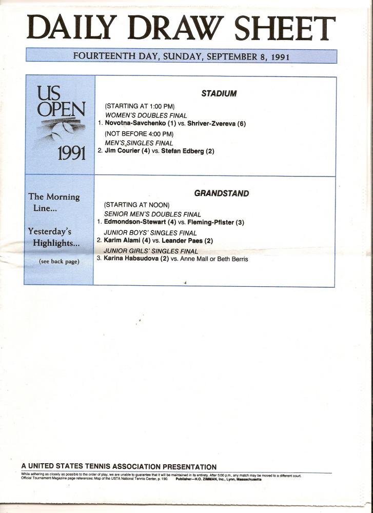 1991 Tennis US Open drawsheet sept 8th 1991 Finals