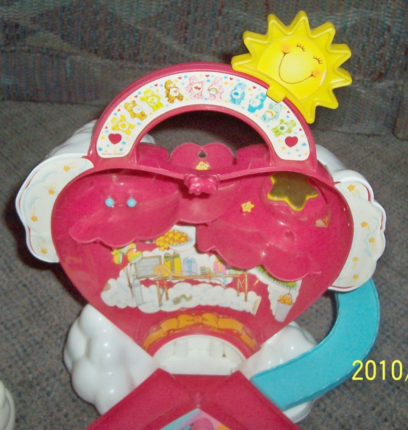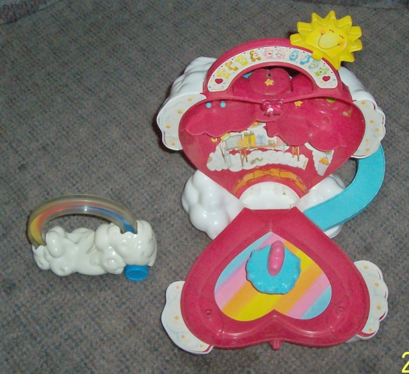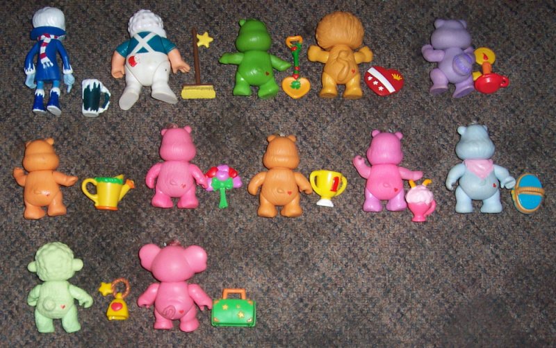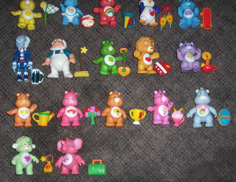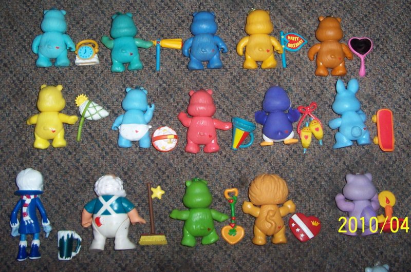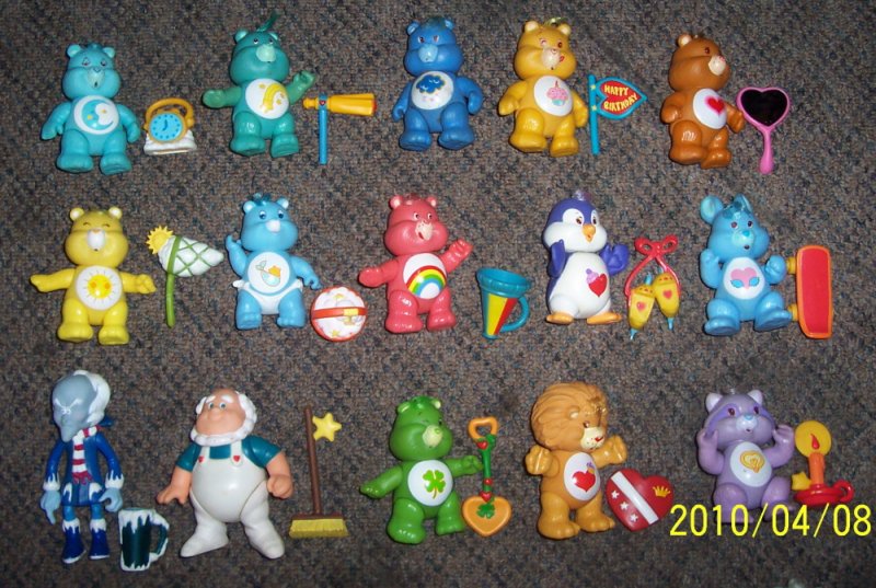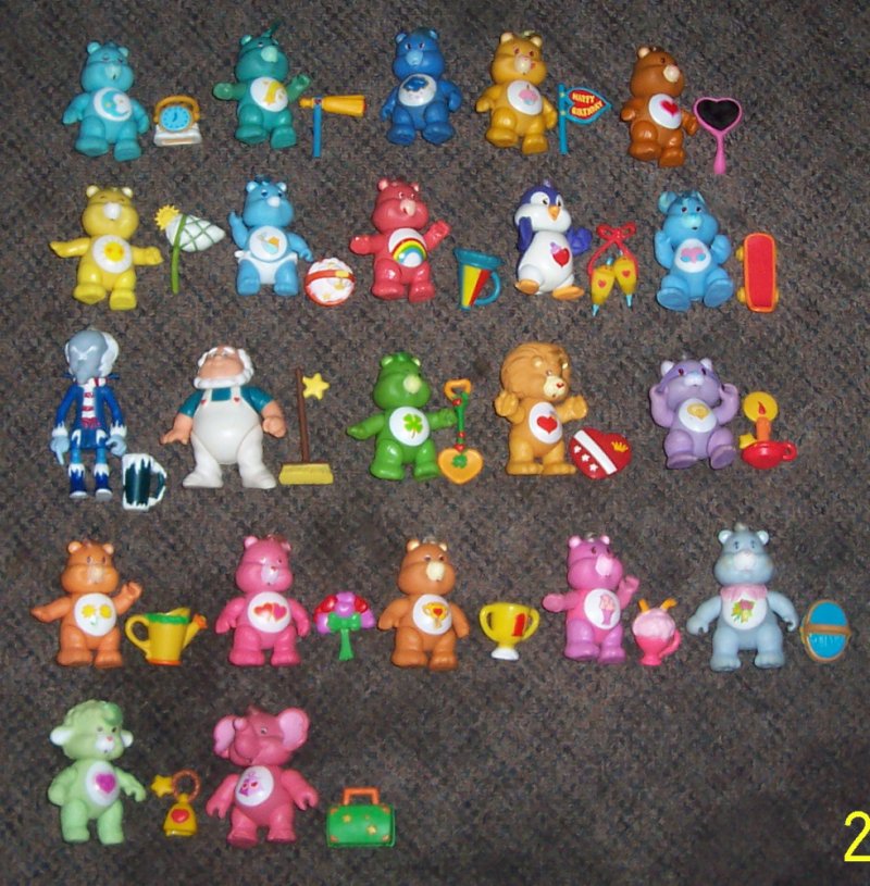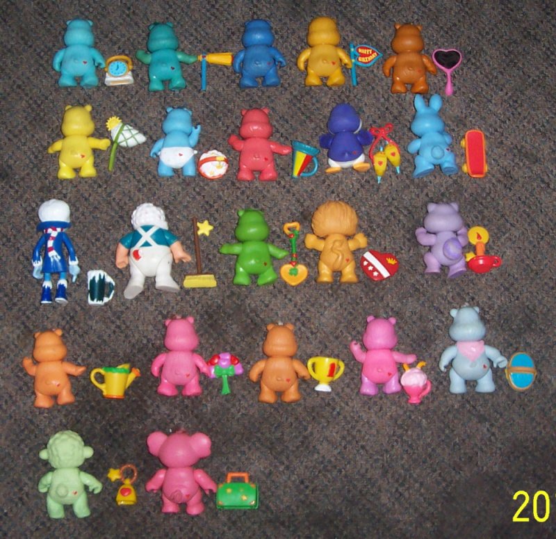 A Near Complete Collection of 1984 Kenner Care Bears Poseable there are 21 Complete Care Bear Poseable Figures bedtime, wish, Birthday, Tenderheart, Funshine, Tugs, cheer, Goodluck, Friendship, Love a Lot, Champ, Share, Grams, Cold Heart, Cloud Keeper and all 6 Care Bear Cousins Gentle Heart Lamb, Brave Heart Lion, Bright Heart Raccon, Swift Heart Rabbit, Cozy Heart Penguin. Baby Hugs is Included But Not Pictured (she does not have her accessory) also included is the Care Alot Playset (which is not Complete) and a Rainbow Roller as stated its a near complete collection only missing grumpys Dumbrella and Baby Hugs Lollipop and cloud Car! Figures range in Good To very good condition they may have a paint rub here or there or possible mark but nothing major which is normal with these collectible figures which are already 26 years old!! The Care a lot Playset is in good conditon but is not complete and stickers are startting to come loose. Rainbow roller is in good condition with a few scuffs here and there