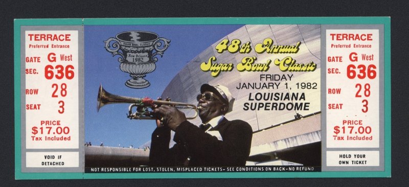 1982 Sugar Bowl Game Full Ticket Pittsburgh Georgia Marino. This Ticket is in very good condition no rips tears or writing as seen in the picture would look great framed with a program or picture a RARE piece of College Bowl history. if you have any questions please don't hesitate to ask. Fast same or next day shipping with delivery confirmation within the U.S. This Item Ships Free within the United States.