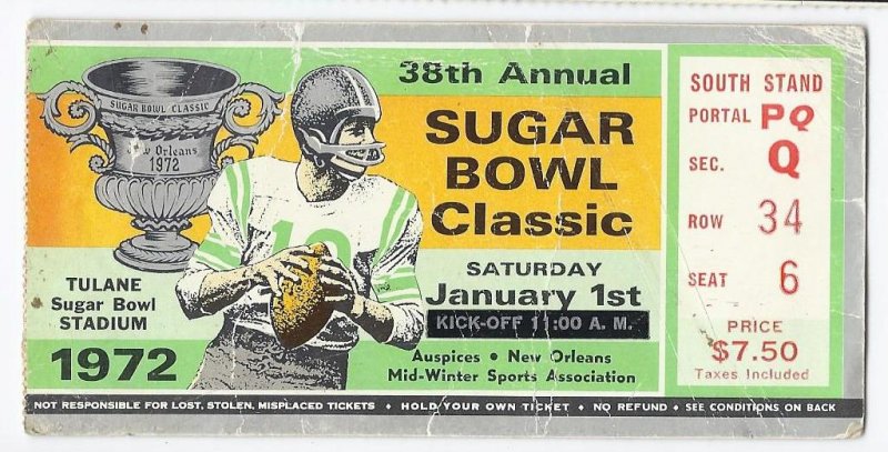 1972 Sugar Bowl Game Ticket Stub Oklahoma Auburn
