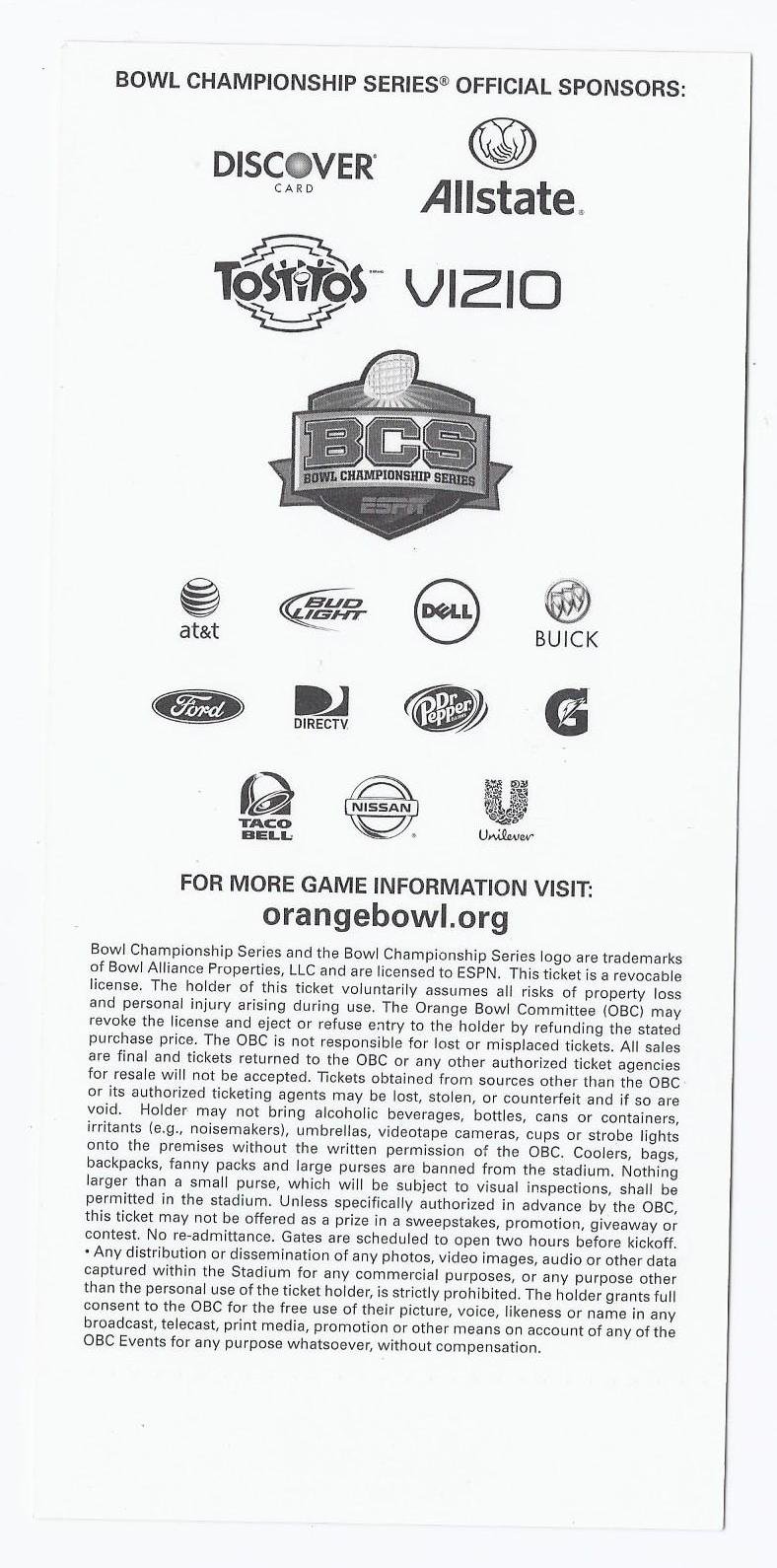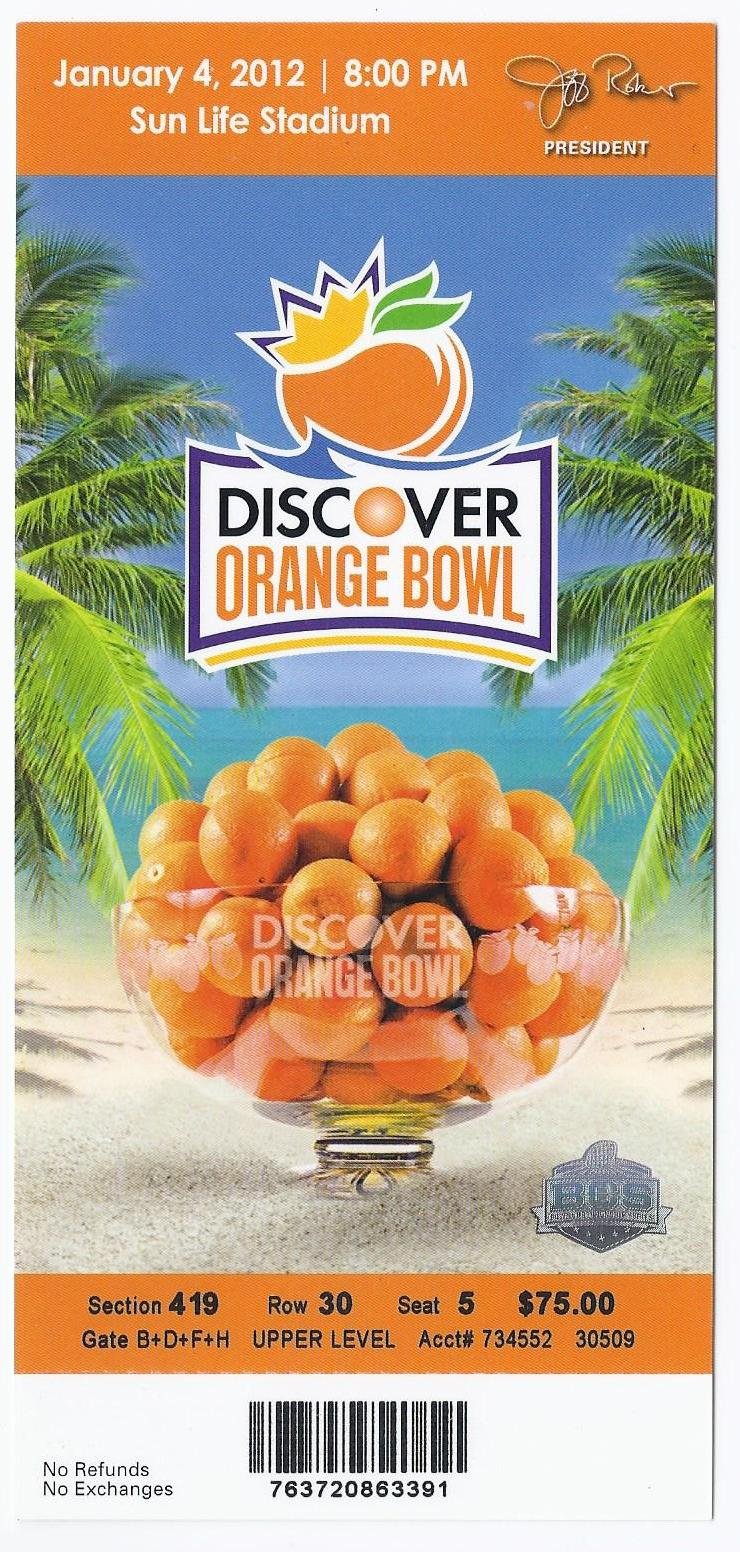 2012 Orange Bowl Game Full Unused Ticket West Virginia Clemson. This Ticket is in Very Good Condition no rips tears writing but does have some creasing along the center a nice RARE piece of College football History if you have any further questions please dont hesitate to ask!