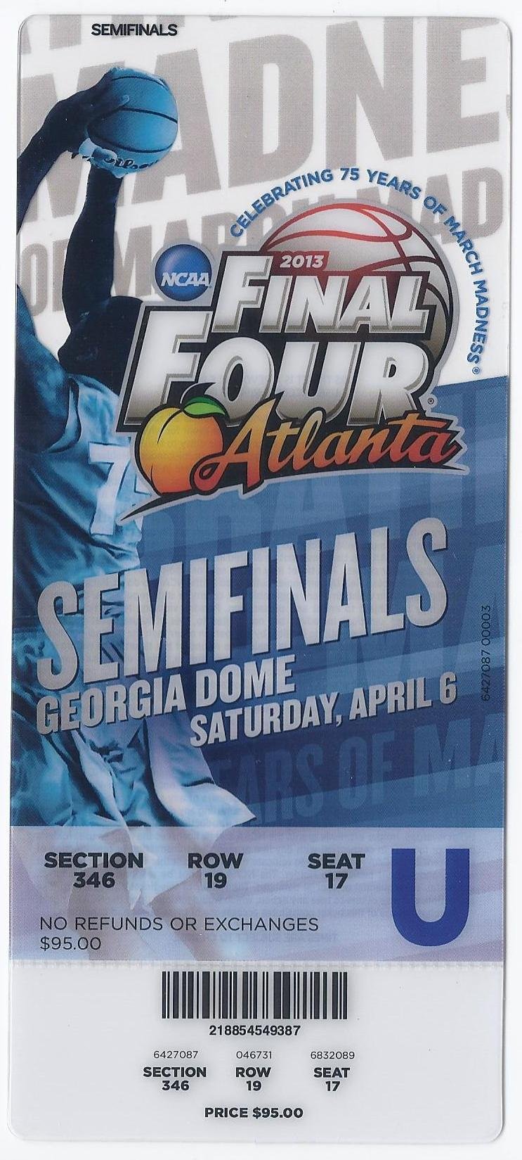 2013 Final Four Semi Finals Full Unused Ticket Wichita State Syracuse Louisville Michigan. This is a full unused ticket it is in good to very good condition nice RARE piece of College Basketball History if you have any further questions please dont hesitate to ask!