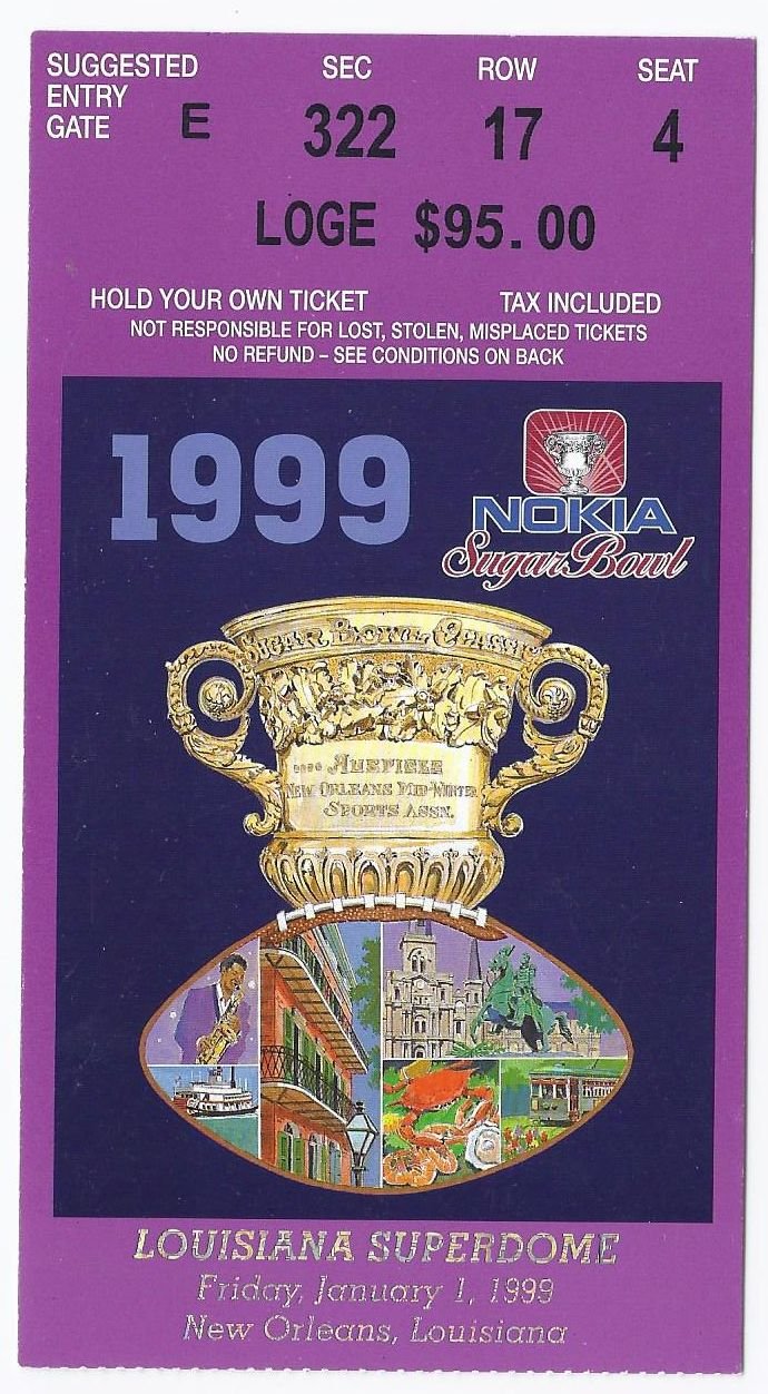 1999 Sugar bowl game ticket stub Ohio State Texas A&M. This Full Ticket is in very good condition no rips tears or writing just some handling wear as seen in the picture would look great framed with a program or picture a RARE piece of College Bowl History if y
