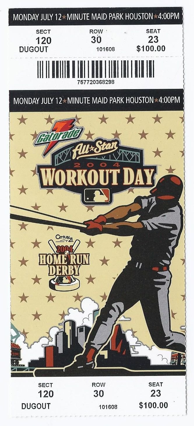 2004 MLB All Star Game Workout Day Full Unused Season Ticket Houston Astros! its in very good Condition writing rips or tears on the ticket but does have some creasing and missing the raincheck portion as can see from the picture a nice RARE piece of Baseball History. if you hav