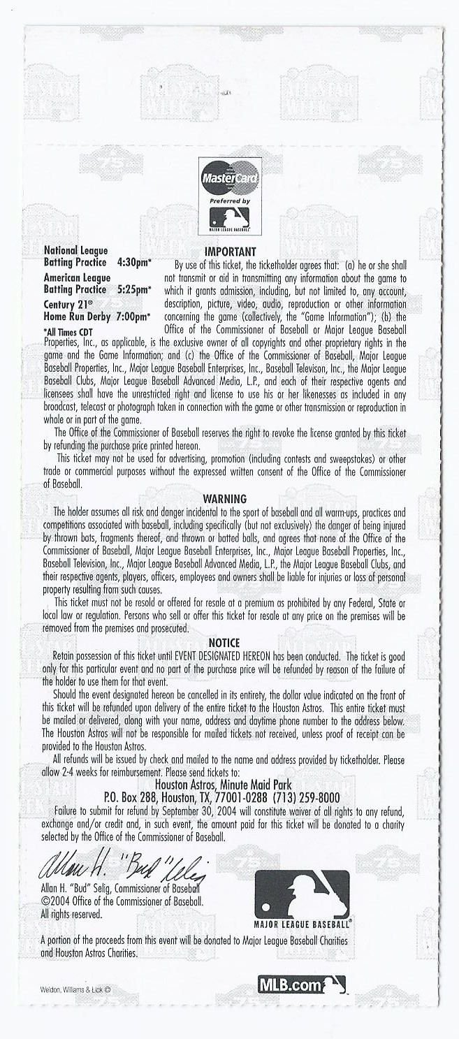 2004 MLB All Star Game Workout Day Full Unused Season Ticket Houston Astros