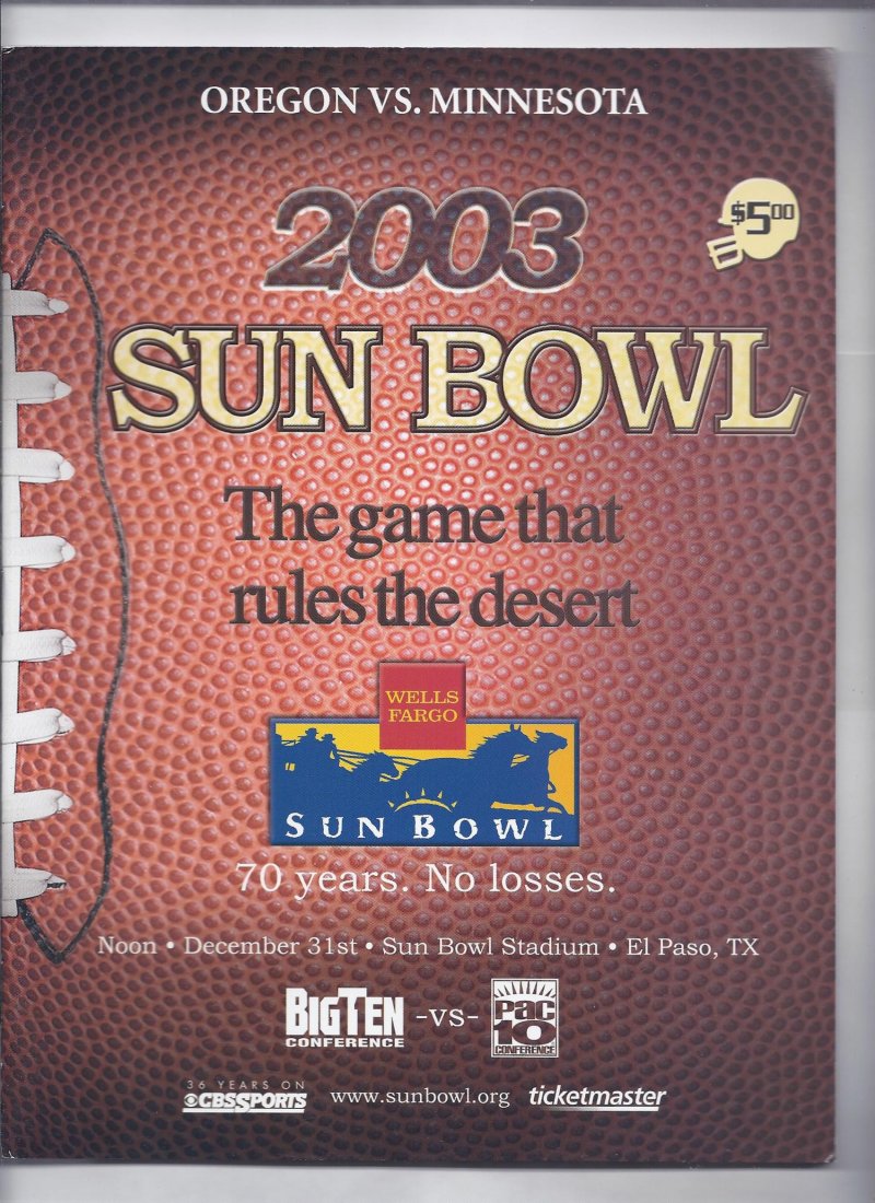 2003 Sun Bowl Game Program Oregon Minnesota. This Program is in very good condition no ripped torn or missing pages, no writing in or on the program just has some minor handling wear nice RARE piece of baseball history History if you have any furrther