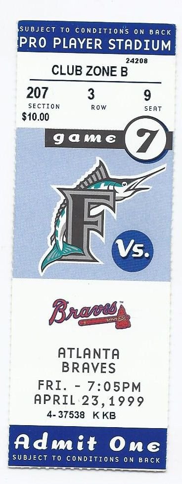 1999 Tickect Stub MLB Baseball Braves @ Marlins 4 23 Pro Player Stadium