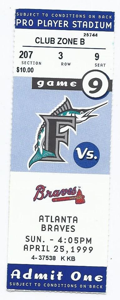 1999 Tickect Stub MLB Baseball Braves @ Marlins 4 25 Pro Player Stadium