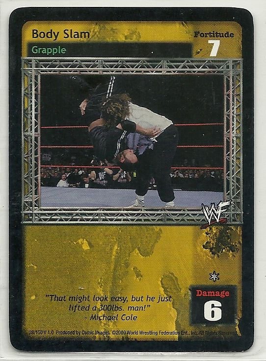 more Great cards @ www.everythingcollectibles.biz For Sale is a wwf raw deal Card #28 V 1.0 Body Slam common. all single cards are shipped in Penny Sleeves and top loaders. all orders ship with delivery confirmation as well. we usually ship within 2 days of receiving an order. Shipping is a Flat $2 no matter how many cards you buy 1 or 1000 its still $2.