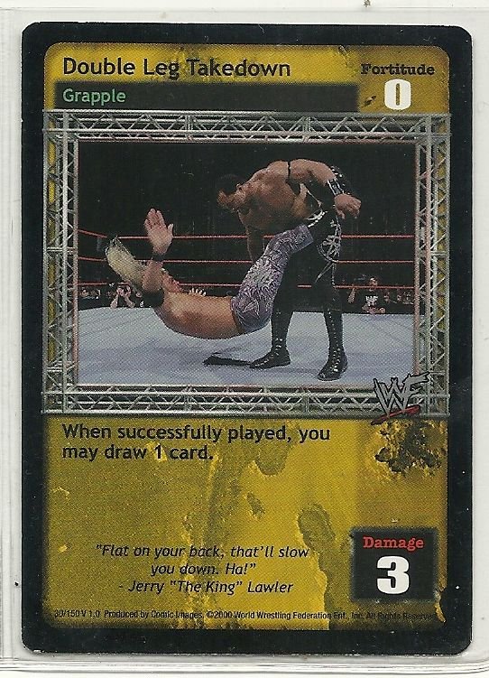 more Great cards @ www.everythingcollectibles.biz For Sale is a wwf raw deal Card #30 V 1.0 Double Leg Takedown Uncommon. all single cards are shipped in Penny Sleeves and top loaders. all orders ship with delivery confirmation as well. we usually ship within 2 days of receiving an order. Shipping is a Flat $2 no matter how many cards you buy 1 or 1000 its still $2.