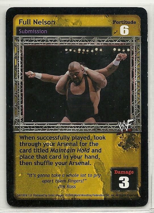 more Great cards @ www.everythingcollectibles.biz For Sale is a wwf raw deal Card #54 V 1.0 Full Nelson common. all single cards are shipped in Penny Sleeves and top loaders. all orders ship with delivery confirmation as well. we usually ship within 2 days of receiving an order. Shipping is a Flat $2 no matter how many cards you buy 1 or 1000 its still $2.