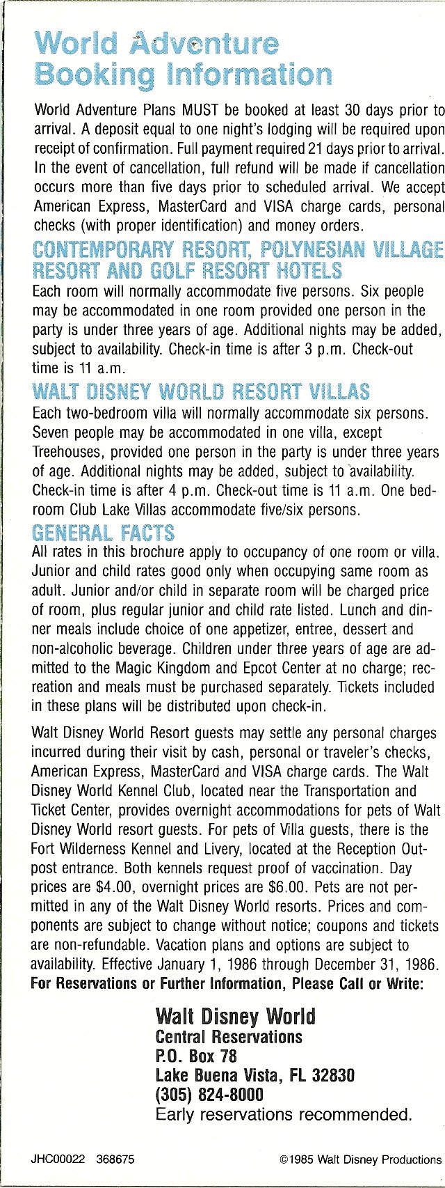 1986 world Adventure Vacation Packages brochure Flyer Vintage Walt Disney World