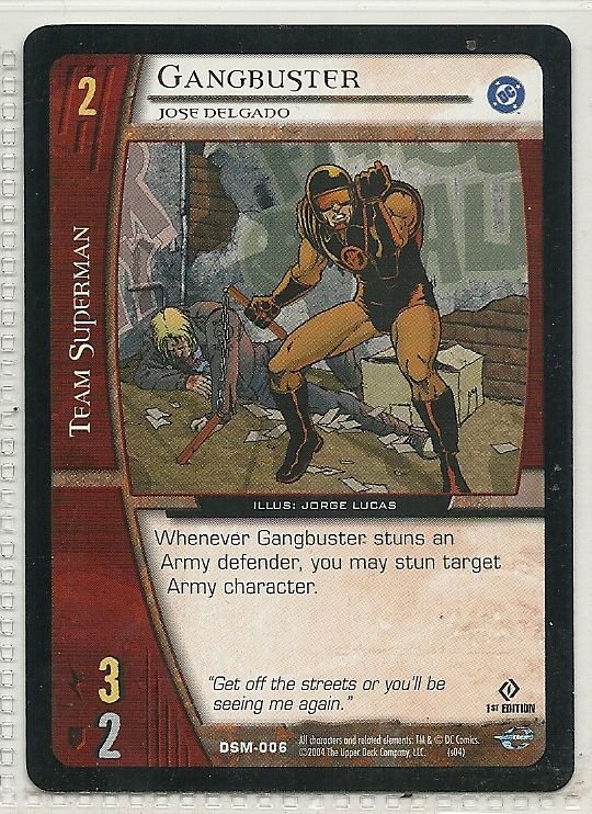 more Great cards @ www.everythingcollectibles.biz For Sale is a vs system Man of Steel Card DSM-006 Gangbuster Jose Delgado common. all single cards are shipped in Penny Sleeves and top loaders. all orders ship with delivery confirmation as well. we usually ship within 2 days of receiving an order. Shipping is a Flat $2 no matter how many cards you buy 1 or 1000 its still $2.