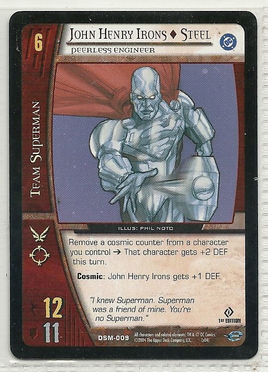 more Great cards @ www.everythingcollectibles.biz For Sale is a vs system Man of Steel Card DSM-009 John Henry Irons @ Steel Peerless Engineer common. all single cards are shipped in Penny Sleeves and top loaders. all orders ship with delivery confirmation as well. we usually ship within 2 days of receiving an order. Shipping is a Flat $2 no matter how many cards you buy 1 or 1000 its still $2.