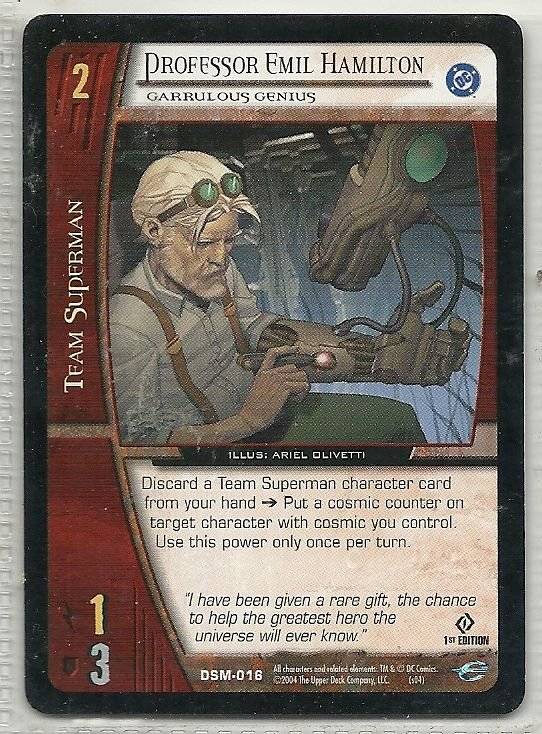 more Great cards @ www.everythingcollectibles.biz For Sale is a vs system Man of Steel Card DSM-016 Professor Emil Hamilton Garrulous Genius Uncommon. all single cards are shipped in Penny Sleeves and top loaders. all orders ship with delivery confirmation as well. we usually ship within 2 days of receiving an order. Shipping is a Flat $2 no matter how many cards you buy 1 or 1000 its still $2.