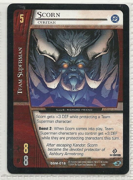 more Great cards @ www.everythingcollectibles.biz For Sale is a vs system Man of Steel Card DSM-018 Scorn Ceritak common. all single cards are shipped in Penny Sleeves and top loaders. all orders ship with delivery confirmation as well. we usually ship within 2 days of receiving an order. Shipping is a Flat $2 no matter how many cards you buy 1 or 1000 its still $2.
