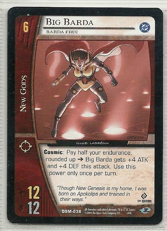 more Great cards @ www.everythingcollectibles.biz For Sale is a vs system Man of Steel Card DSM-036 Big Barda Barda Free common. all single cards are shipped in Penny Sleeves and top loaders. all orders ship with delivery confirmation as well. we usually ship within 2 days of receiving an order. Shipping is a Flat $2 no matter how many cards you buy 1 or 1000 its still $2.