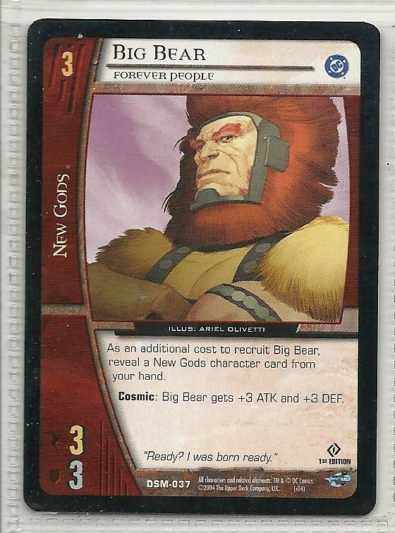 more Great cards @ www.everythingcollectibles.biz For Sale is a vs system Man of Steel Card DSM-037 Big Bear Forever People common. all single cards are shipped in Penny Sleeves and top loaders. all orders ship with delivery confirmation as well. we usually ship within 2 days of receiving an order. Shipping is a Flat $2 no matter how many cards you buy 1 or 1000 its still $2.