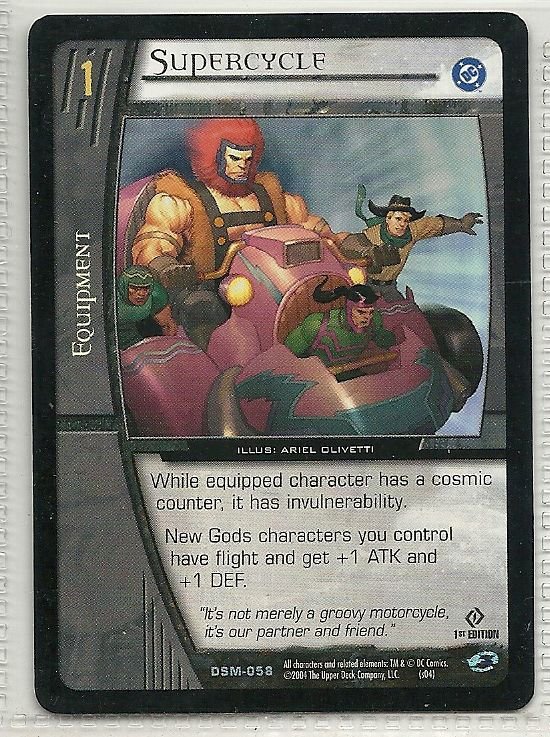 more Great cards @ www.everythingcollectibles.biz For Sale is a vs system Man of Steel Card DSM-058 Supercycle Uncommon. all single cards are shipped in Penny Sleeves and top loaders. all orders ship with delivery confirmation as well. we usually ship within 2 days of receiving an order. Shipping is a Flat $2 no matter how many cards you buy 1 or 1000 its still $2.