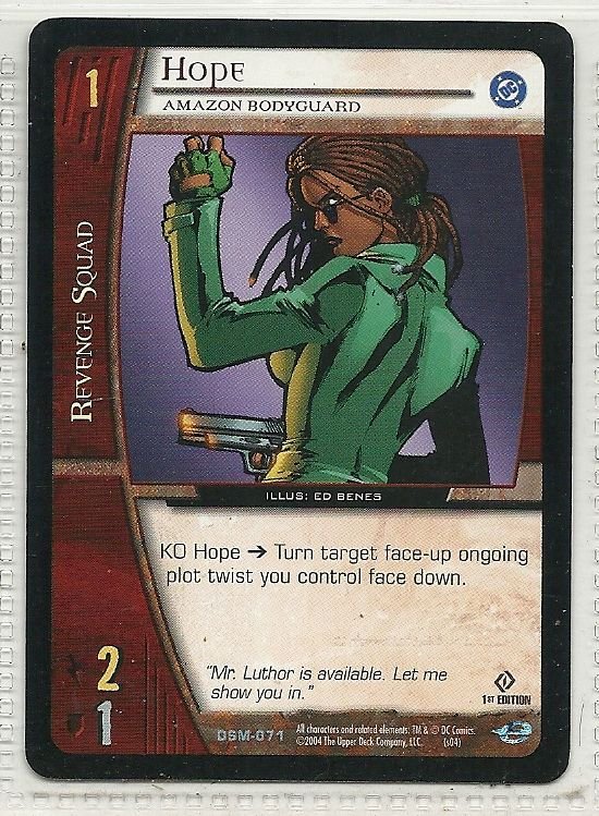 more Great cards @ www.everythingcollectibles.biz For Sale is a vs system Man Of Steel Card DSM-071 Hope Uncommon. all single cards are shipped in Penny Sleeves and top loaders. all orders ship with delivery confirmation as well. we usually ship within 2 days of receiving an order. Shipping is a Flat $2 no matter how many cards you buy 1 or 1000 its still $2.