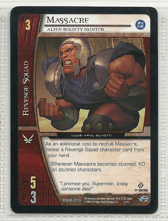 more Great cards @ www.everythingcollectibles.biz For Sale is a vs system Man of Steel Card DSM-075 Massacre Alien Bounty Hunter Uncommon. all single cards are shipped in Penny Sleeves and top loaders. all orders ship with delivery confirmation as well. we usually ship within 2 days of receiving an order. Shipping is a Flat $2 no matter how many cards you buy 1 or 1000 its still $2.