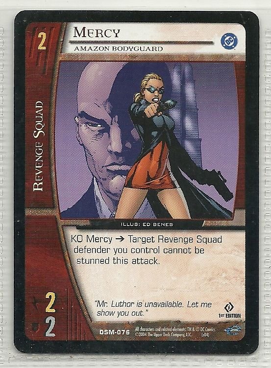 more Great cards @ www.everythingcollectibles.biz For Sale is a vs system Man of Steel Card DSM-076 Mercy Amazon Bodyguard common. all single cards are shipped in Penny Sleeves and top loaders. all orders ship with delivery confirmation as well. we usually ship within 2 days of receiving an order. Shipping is a Flat $2 no matter how many cards you buy 1 or 1000 its still $2.