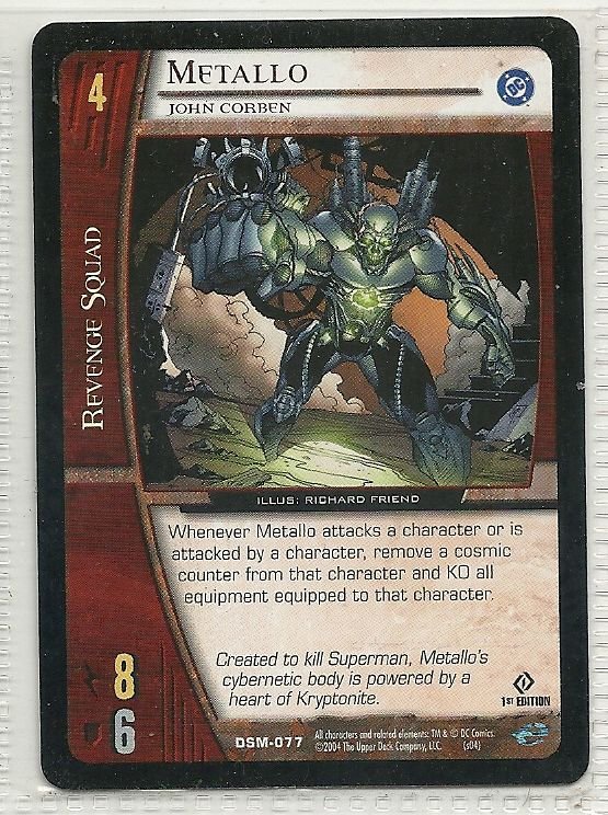 more Great cards @ www.everythingcollectibles.biz For Sale is a vs system Man of Steel Card DSM-077 Metallo John Corben common. all single cards are shipped in Penny Sleeves and top loaders. all orders ship with delivery confirmation as well. we usually ship within 2 days of receiving an order. Shipping is a Flat $2 no matter how many cards you buy 1 or 1000 its still $2.