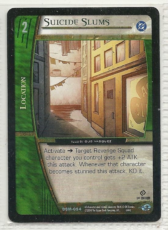 more Great cards @ www.everythingcollectibles.biz For Sale is a vs system Man Of Steel Card DSM-094 Suicide Slums Uncommon. all single cards are shipped in Penny Sleeves and top loaders. all orders ship with delivery confirmation as well. we usually ship within 2 days of receiving an order. Shipping is a Flat $2 no matter how many cards you buy 1 or 1000 its still $2.