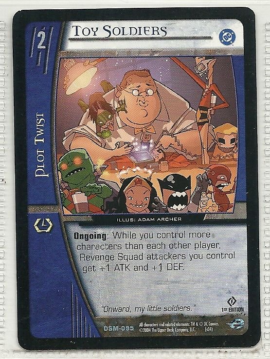 more Great cards @ www.everythingcollectibles.biz For Sale is a vs system Man Of Steel Card DSM-095 Toy Soldiers Uncommon. all single cards are shipped in Penny Sleeves and top loaders. all orders ship with delivery confirmation as well. we usually ship within 2 days of receiving an order. Shipping is a Flat $2 no matter how many cards you buy 1 or 1000 its still $2.