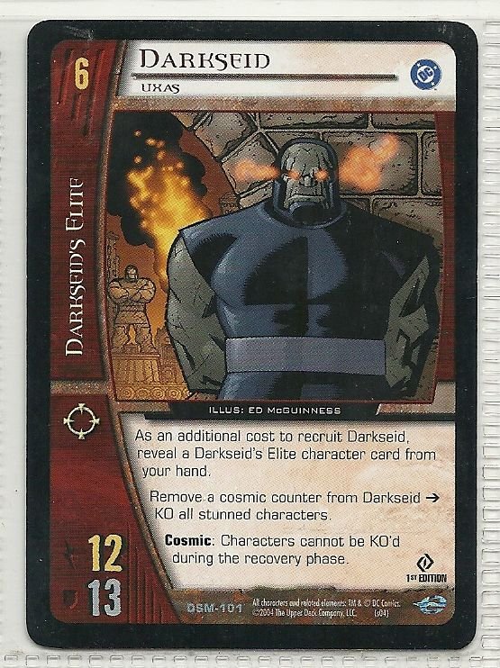 more Great cards @ www.everythingcollectibles.biz For Sale is a vs system Man of Steel Card DSM-101 Darkseid, Uxas common. all single cards are shipped in Penny Sleeves and top loaders. all orders ship with delivery confirmation as well. we usually ship within 2 days of receiving an order. Shipping is a Flat $2 no matter how many cards you buy 1 or 1000 its still $2.