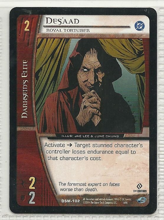 more Great cards @ www.everythingcollectibles.biz For Sale is a vs system Man of Steel Card DSM-102 Desaad Royal Torturer common. all single cards are shipped in Penny Sleeves and top loaders. all orders ship with delivery confirmation as well. we usually ship within 2 days of receiving an order. Shipping is a Flat $2 no matter how many cards you buy 1 or 1000 its still $2.